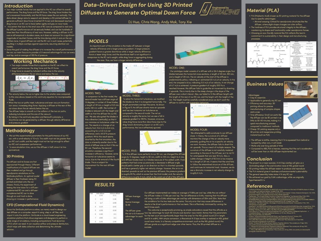 This is the data driven design poster for our invented diffuser. The diffuser is used in our remote controlled car in the NSL national competition.
